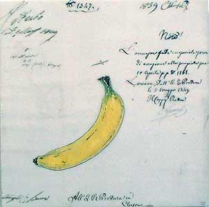 | Kenna Moser "Banana" 2000 beeswax, vintage text and oil paint on cherry 11.5" X 11.5" |