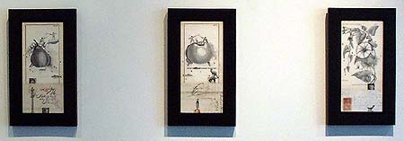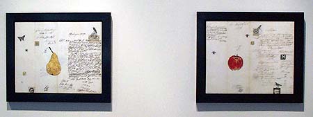 | Kenna Moser "Pear" beeswax, vintage text, paint on oak 1999 13.5" X 16.5"
