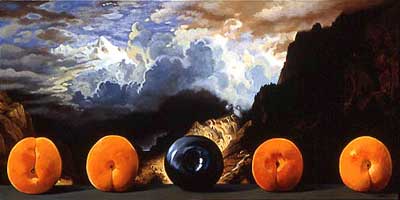 Sherrie Wolf "Four Apricots and a Plum, after Bierstadt" 2003 Oil on Canvas 18" x 36" |